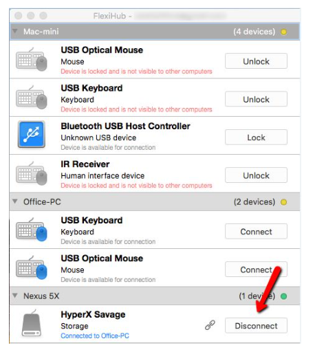 注意:默认情况下,所有连接到你每个节点的USB设备(即当前登录FlexiHub账户的电脑)都将可供连接到所有其他节点
