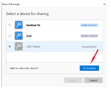 图标显示“不支持”表示 Donglify 不支持此类设备。在这种情况下,你可以用FlexiHub分享你的设备: